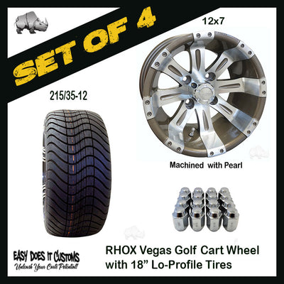 RHOX Vegas, Machined w/Pearl w/ Center Cap, 12x7 ET-25 with 215/35-12 Lo Pro Tire - SET OF 4 Golf Cart Tires