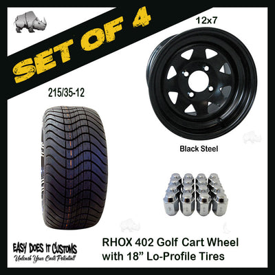 TIR-402 Steel, Black, 12x7.5, 3:4.5 Offset with 215/35-12 Lo Pro Tire - SET OF 4 Golf Cart Tires
